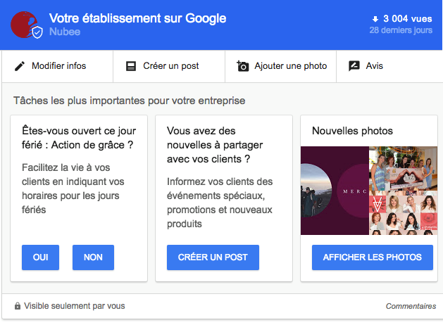 Google Mon entreprise est maintenant intégré directement dans le résultat de recherche. Plus besoin de se connecter à son compte : si vous êtes déjà connecté, vous y verrez directement les nouvelles options d’administration dans l’en-tête de la page, sous la zone bleue. D’entrée de jeu, on m’a demandé si mon entreprise était ouverte pour l’Action Grâce et on m’a proposé les tâches les plus importantes à faire sur ma fiche.