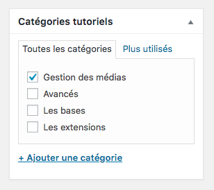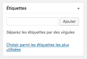Les étiquettes (ou tags en anglais), fonctionnent de la même façon que les catégories, à une différence près: pour ajouter une étiquette, il faut rechercher son nom dans le champ prévu à cet effet et cliquer sur le résultat qui apparaît.