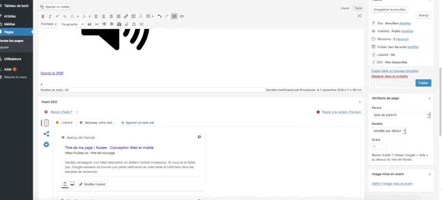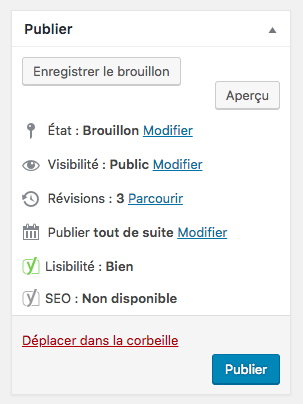 - Un avant goût de la lisibilité et du référencement de votre page (voir le tutoriel « Yoast SEO » pour plus de détail à ce sujet).