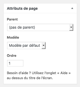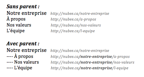 Grâce à cet onglet, vous pourrez associer un parent à votre page. Par exemple, une page nommée « Notre entreprise » pourrait être le parent des pages « À propos », « Nos valeurs » et « L’équipe ». Comme démontré dans l’image ci-dessus, le fait d’associer un parent à une page modifient également son URL. Modifier l’ordre des pages permet simplement de structurer la façon dont elles s’affichent dans la liste de leur type de contenu.