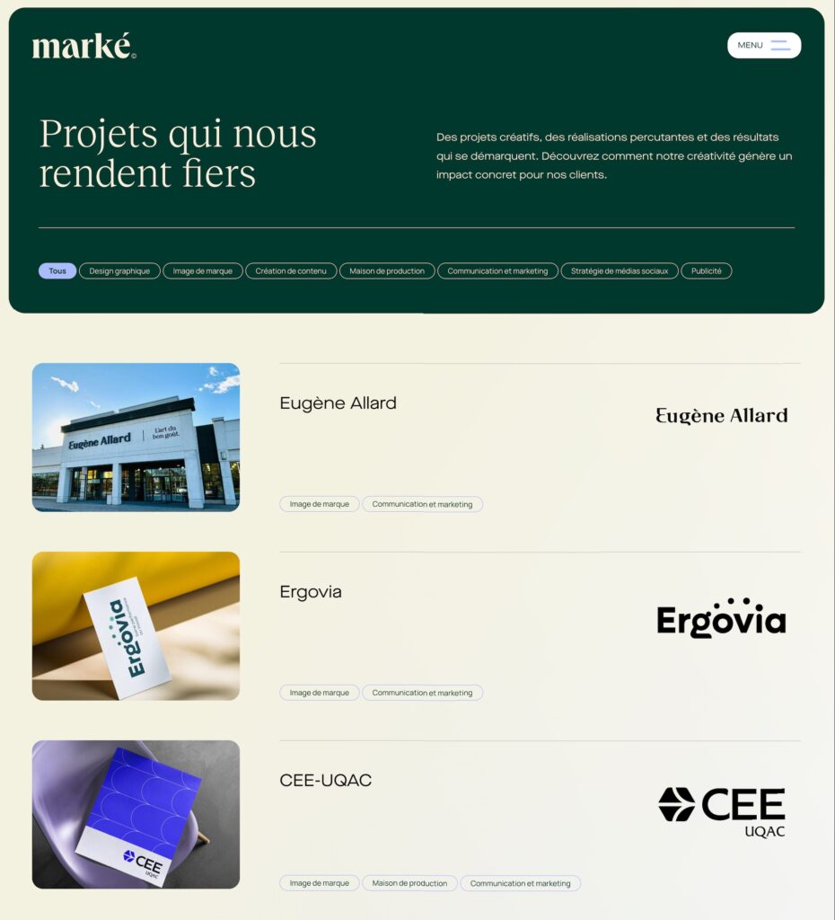 Le site repose sur une programmation web sur mesure sous WordPress, offrant à l’équipe Marké une grande autonomie et une flexibilité maximale. Parmi les éléments clés :