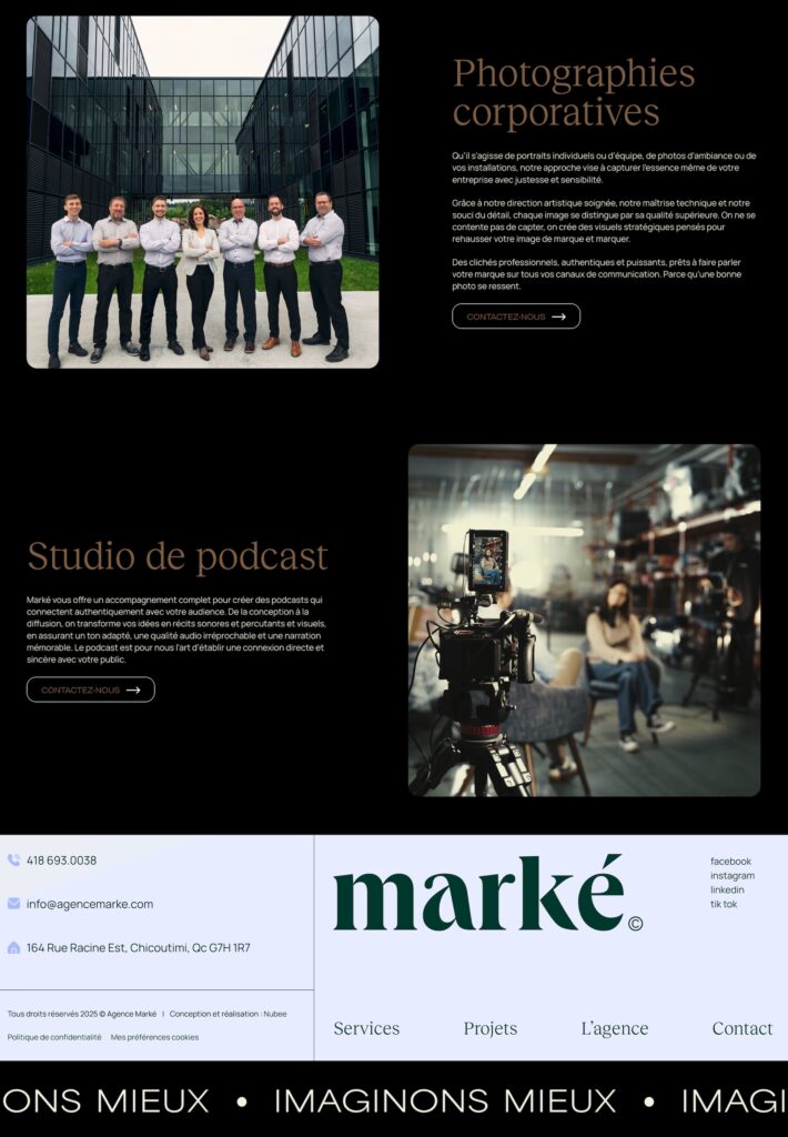 Dès les premières discussions, le mandat visait à positionner le site comme un véritable levier d’affaires. L’Agence Marké souhaitait un site qui soutienne autant la notoriété que la conversion, tout en facilitant la présentation de son offre complète. Un travail stratégique essentiel pour assurer la cohérence entre le positionnement de l’agence et son écosystème numérique.
