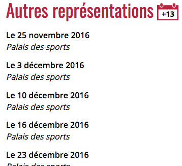 On a également simplifié les informations affichées pour les autres représentations. Par exemple, il n’était pas important d’afficher l’endroit, car les représentations se déroulaient presque toujours au même endroit. Le lieu est affiché à l’étape de l’achat de billets de toute façon.