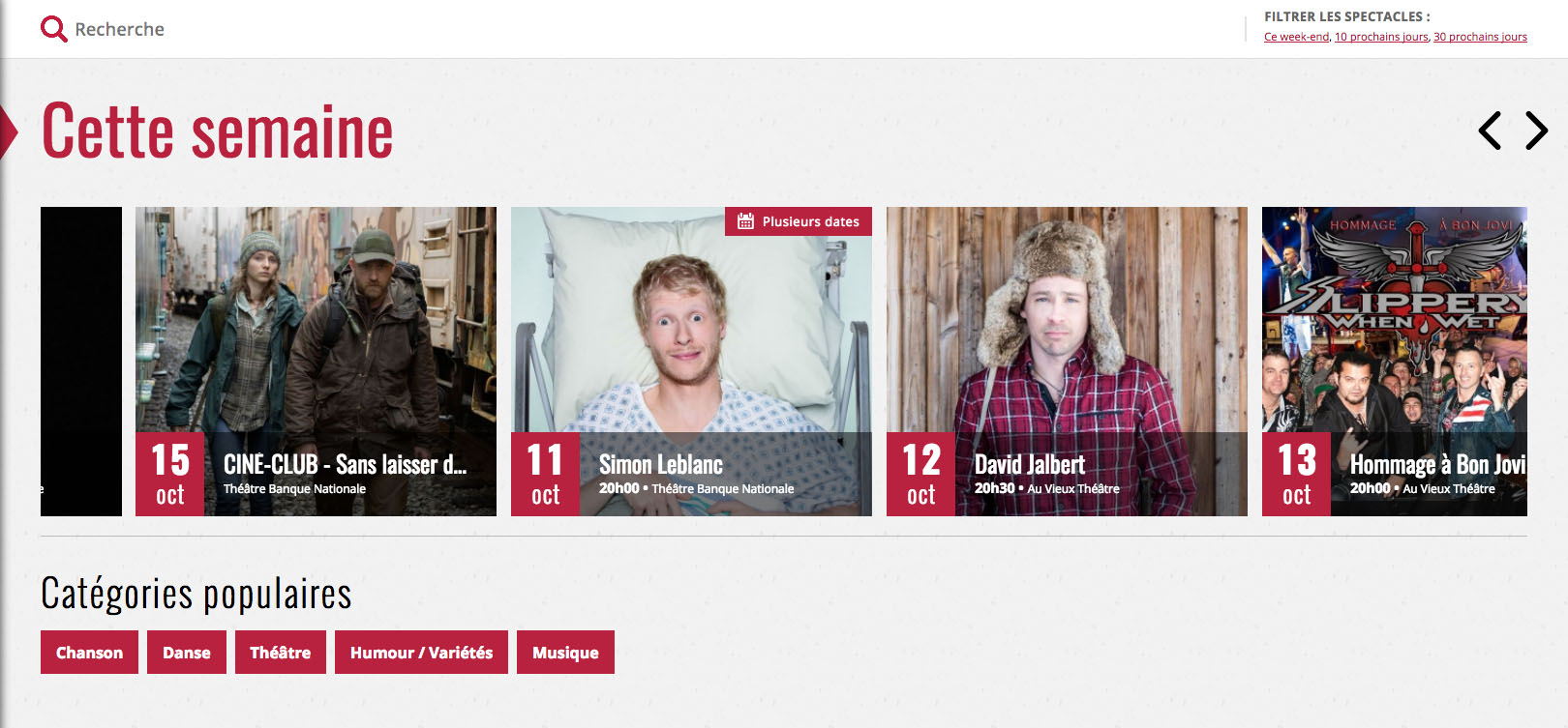 Nous avons donc séparé les filtres en plusieurs éléments plus intuitifs : une liste des spectacles de la semaine, des filtres pour ce week-end et les 10 et 30 prochains jours et les catégories populaires. Tout ce qui était jadis complexe est désormais accessible en un clic.