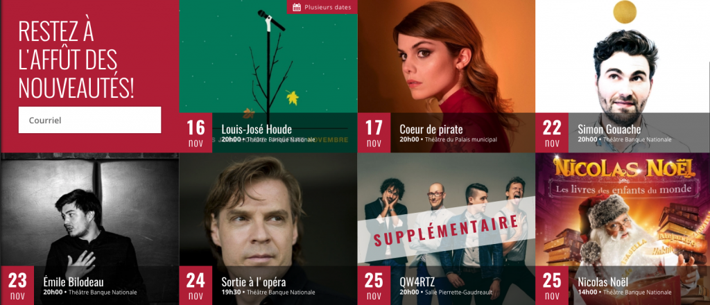 À l’origine, nous avions opté pour un concept où les informations sur un évènement n’étaient visibles qu’au survol de la souris ou au clic. L’idée était de créer une expérience visuelle épurée et de mettre de l’avant les photos professionnelles très esthétiques des artistes. Bien que l’approche épurée ait plu d’un point de vue artistique, nous nous sommes rendu compte que les gens ne reconnaissaient pas forcément les artistes par leur photo. De plus, il était difficile d’avoir une vue d’ensemble des spectacles à venir sans voir leurs titres. En outre, les dates n’étaient pas assez mises à l’avant, alors qu’il s’agit d’un aspect important lorsqu’on se « magasine » un spectacle.